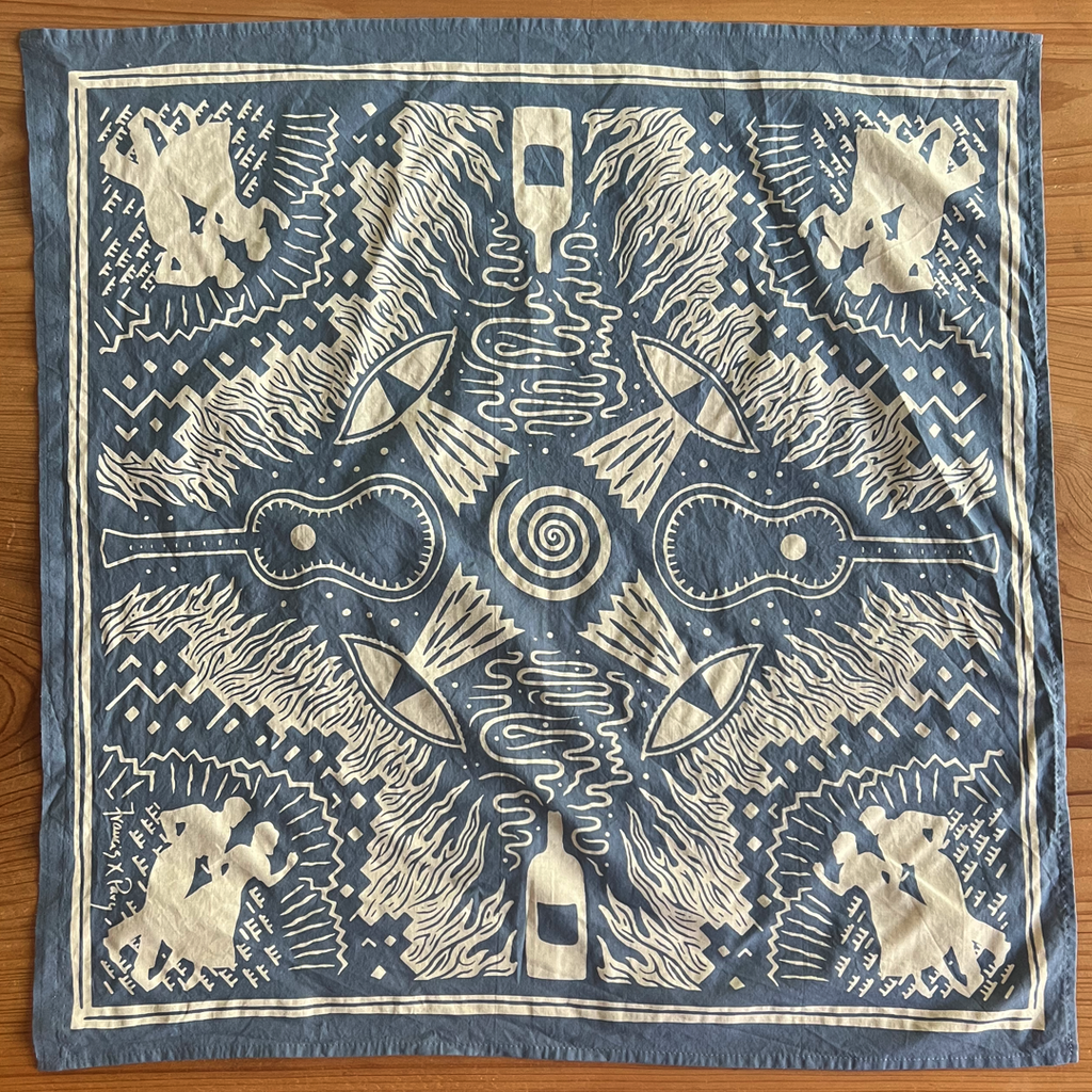 Limited-edition Pavy bandanas are true discharge bandanas, not plastisol-printed. They are washed, cut, and sewn in East Nashville.